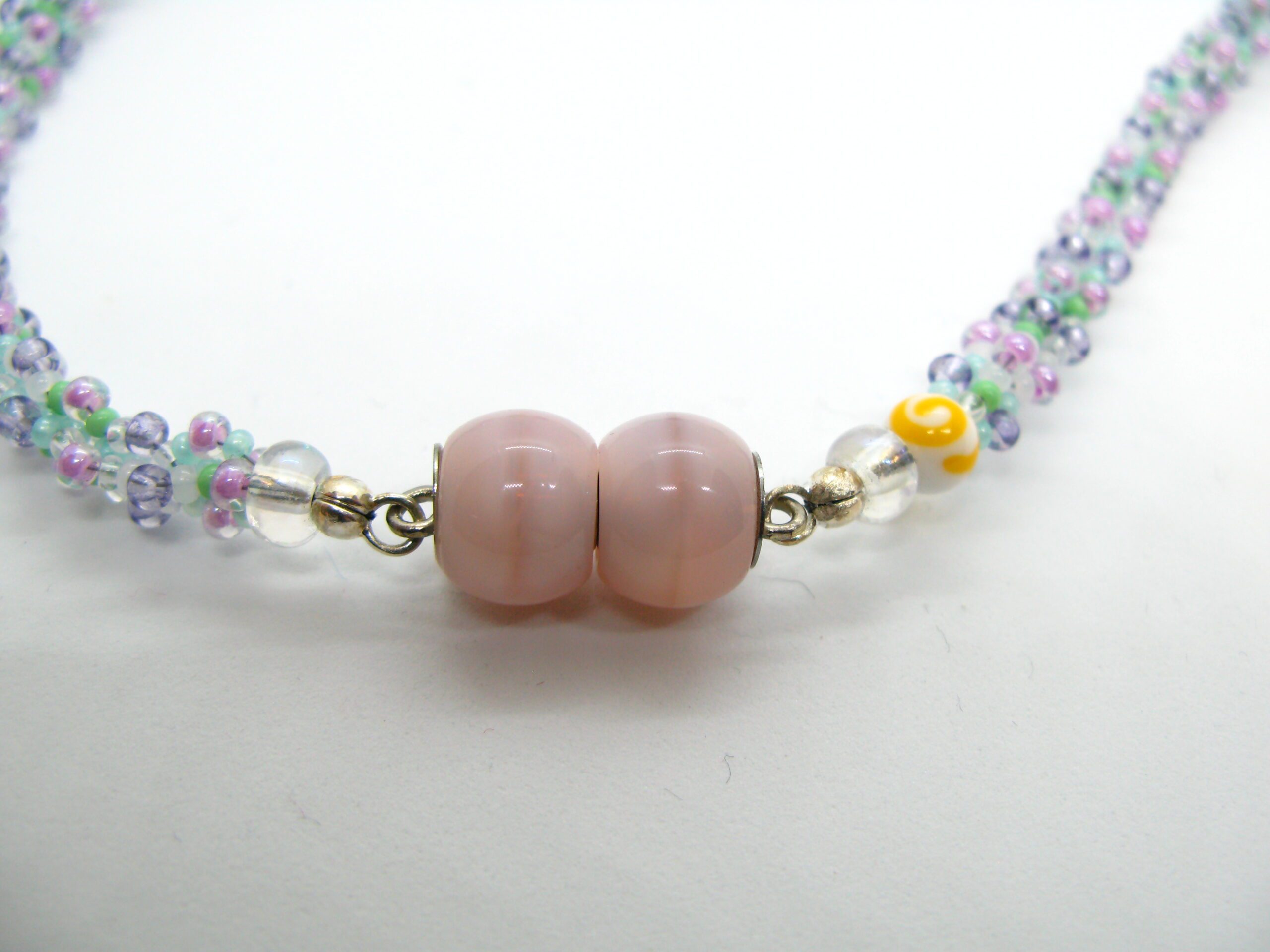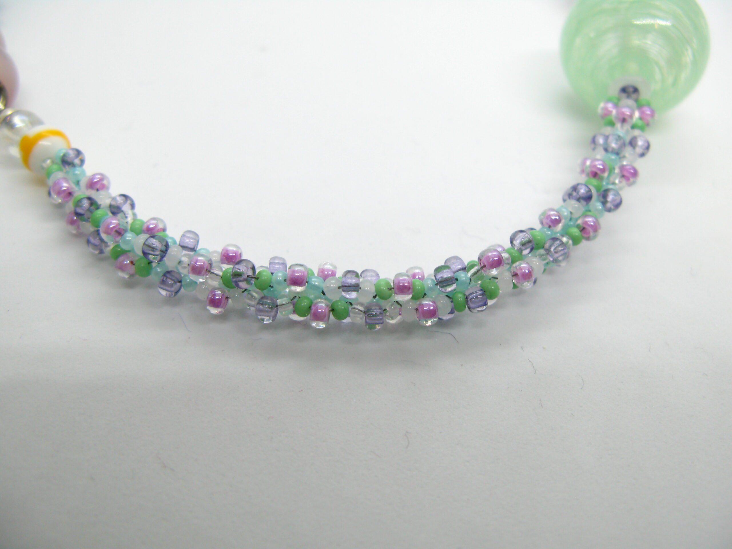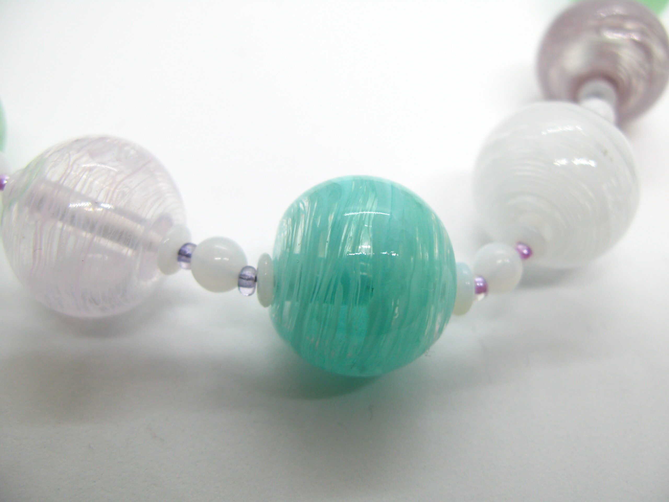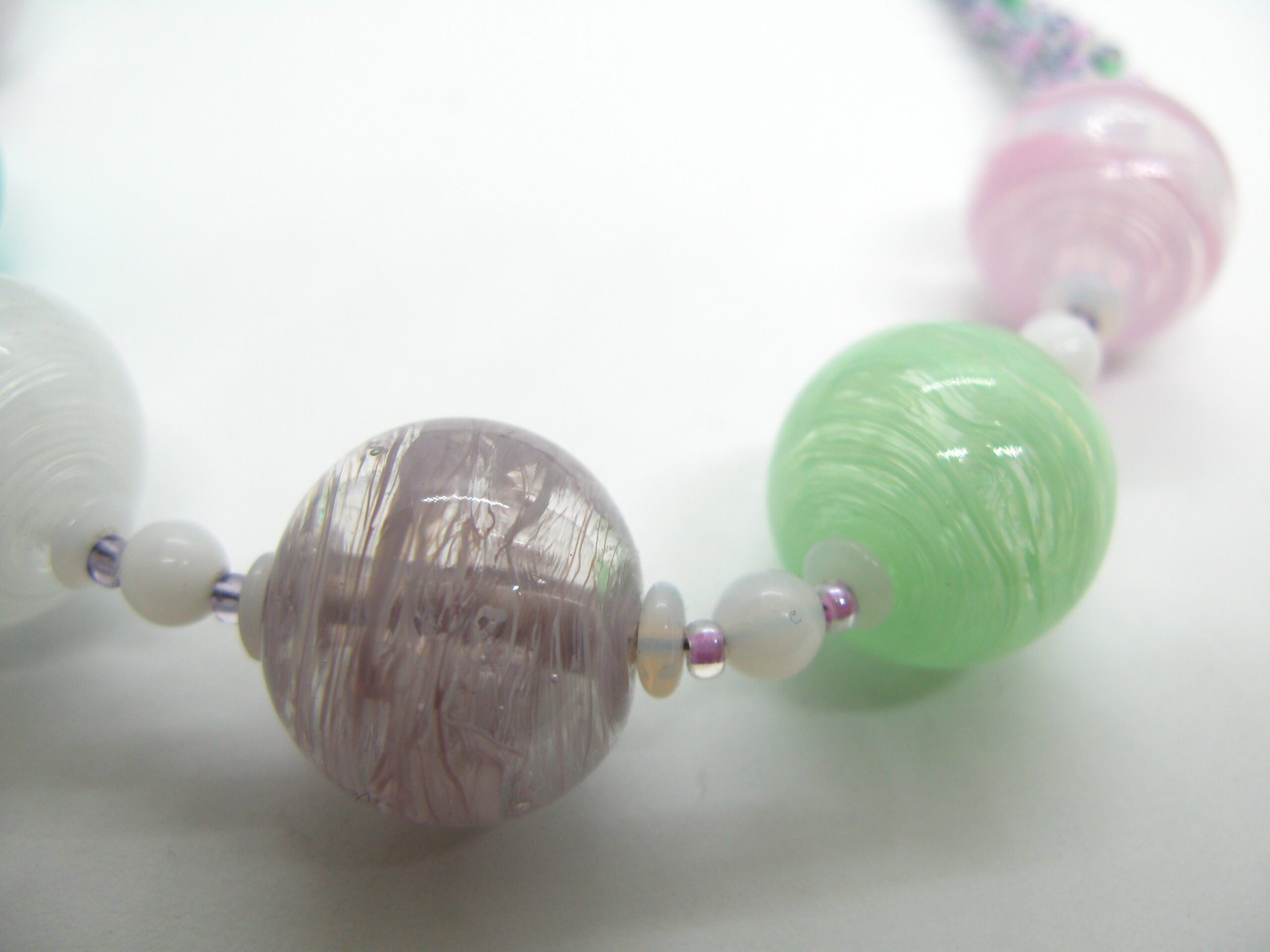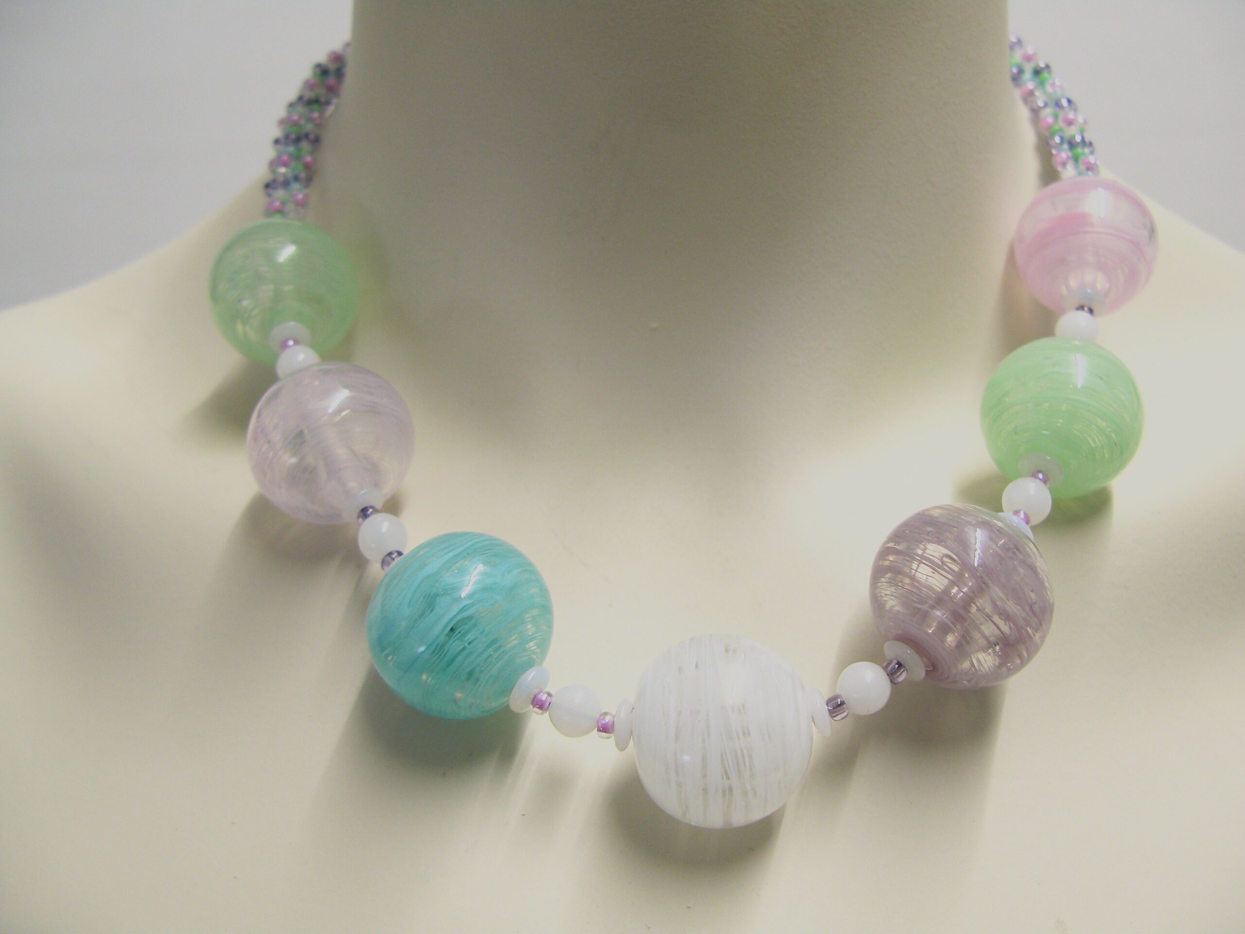Eine Herausforderung in der Kunst der Perlenherstellung ist die handgemachte Hohlglasperle. Diana ist aus diesen Perlen kreiert. Sie ist aufwendig auf 4 Strängen gefädelt. Farben: Pastell Länge: 46 cm Verschluss: Magnet aus Glas